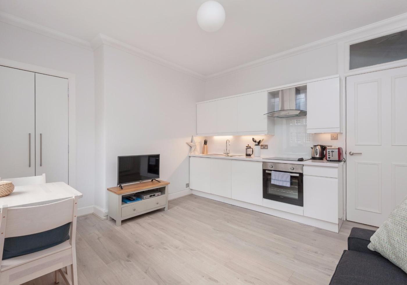 The kitchenette is fitted with an oven and a microwave, as well as a kettle. A flat-screen TV is featured.