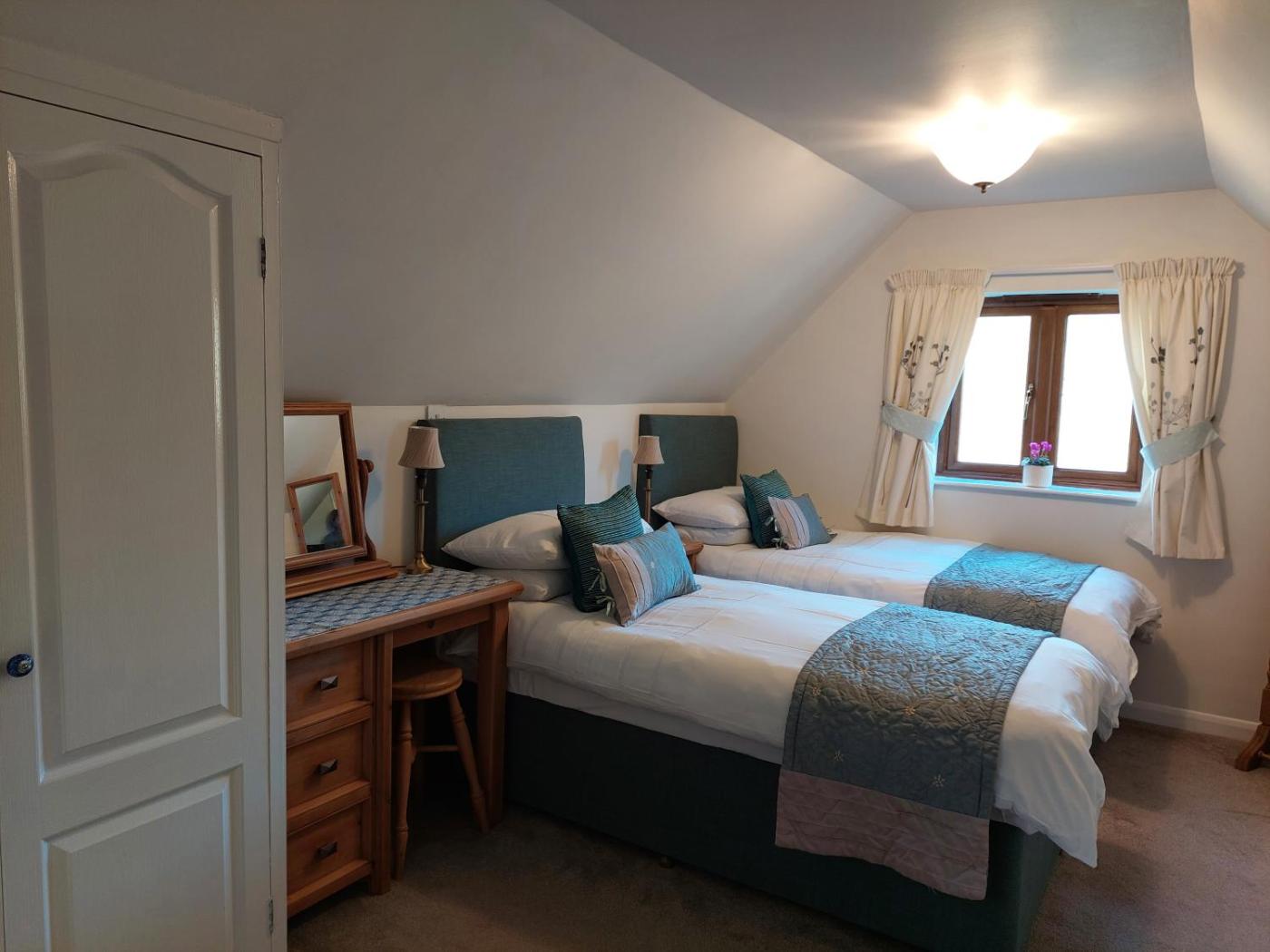 Double Room with Private Bathroom. This is a newly re-furbished room on the first floor with private external bathroom, which is just outside the room with bath and shower. There is only one other room on this floor, so guest interaction when accessing the bathroom is minimal. Robes are provided along with complimentary toiletries. The room is very quiet and has delightful views over the surrounding countryside. Tea, coffee, speciality teas and drinking chocolate together with biscuits and chocolates add luxury to your stay at Innisfree Cottage.
