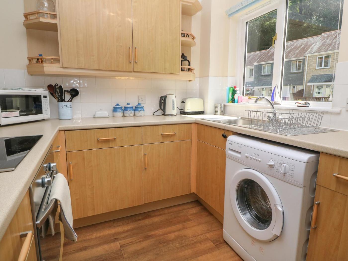 The holiday home features 2 bedrooms, a TV, a fully equipped kitchen with an oven and a microwave, a washing machine, and 1 bathroom with a shower.
