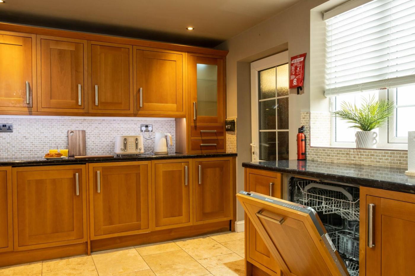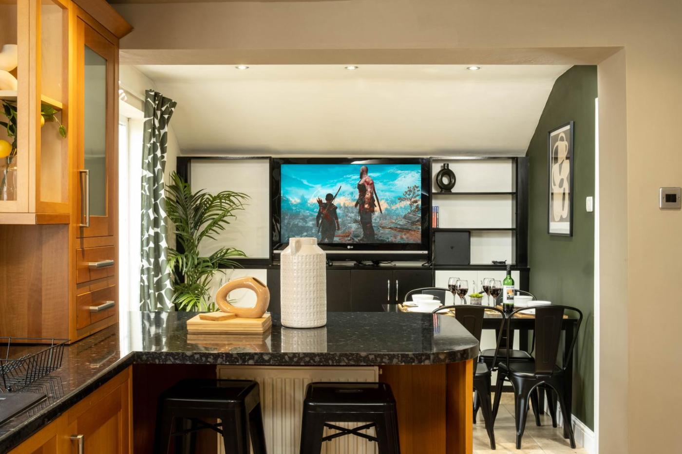 Holiday Home. This holiday home comes with 1 living room, 3 separate bedrooms and 3 bathrooms with a hairdryer. The well-equipped kitchen has a stovetop, a refrigerator, a dishwasher and kitchenware. Among the room amenities are a washing machine, a dining area, video games as well as a patio and garden views. The unit has 5 beds.