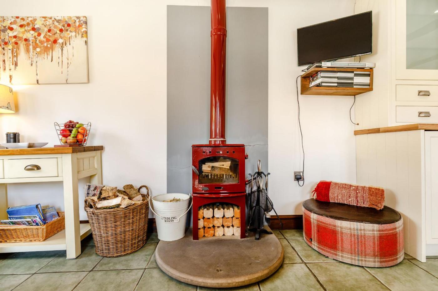 The holiday home features 1 bedroom, a TV, a fully equipped kitchen with a dishwasher and an oven, a washing machine, and 1 bathroom with a hot tub. There is also a seating area and a fireplace.